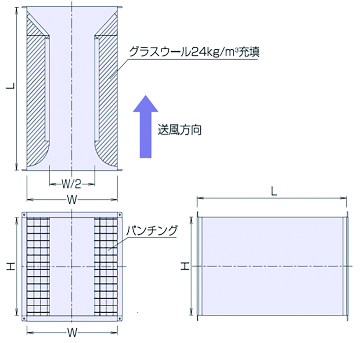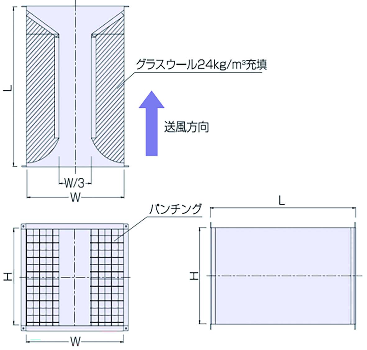 高減衰タイプ 高い減音量を得る事が出来ます。 消音エルボの削減が可能です。 ダクト寸法に合わせた製作が可能です。 低圧力損失タイプ 低圧力損失タイプで減音効果を得る事が出来ます。 狭い場所にも設置可能です。